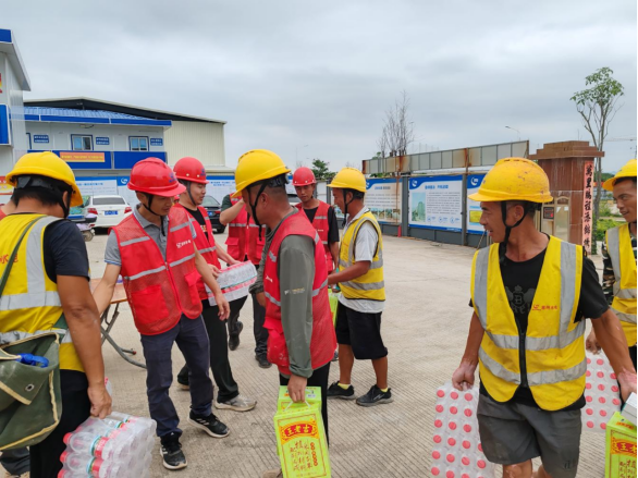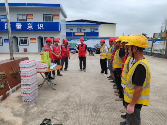活動現(xiàn)場,臨時黨支部成員與項目部工作人員化身“清涼使者”,將藿香正氣水、王老吉涼茶、礦泉水等防暑降溫物資一一遞到工人手中?!疤鞖庋谉?,一定要注意防暑,合理安排作業(yè)時間!”他們一邊發(fā)放物資,一邊反復叮囑工人們做好自我防護,科學調整作息,確保安全生產。接過物資的工人們臉上洋溢著笑容,紛紛對這份及時的關懷表示感謝。