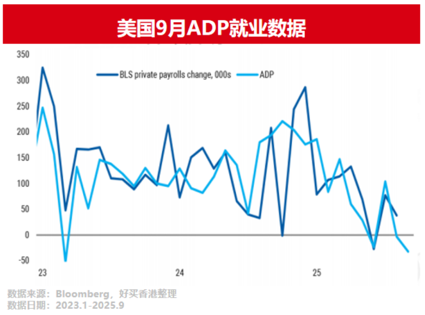 看被稱為“小非農(nóng)”的ADP就業(yè)數(shù)據(jù),9月美國ADP就業(yè)數(shù)據(jù)落入負(fù)區(qū)間,再次印證了當(dāng)前就業(yè)市場的走弱跡象。