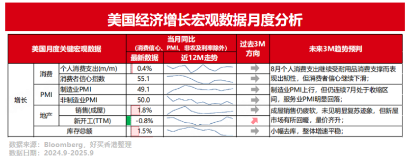 看經(jīng)濟(jì)增長相關(guān)指標(biāo),各指標(biāo)整體上表現(xiàn)出一定韌性。得益于耐用品消費的支撐,消費支出數(shù)據(jù)呈現(xiàn)出一定的韌性。地產(chǎn)端新屋市場出現(xiàn)一些積極的修復(fù)信號,可能與近期抵押貸款利率的下行有關(guān)。