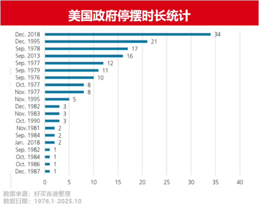 此次美國政府停擺將進(jìn)入第三周,停擺時長已超過歷史平均天數(shù)。后續(xù)經(jīng)濟(jì)與政治壓力或加大兩黨達(dá)成共識的迫切性,隨時間推移政府重新開門的概率或逐漸增加。