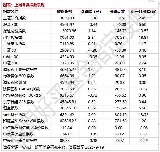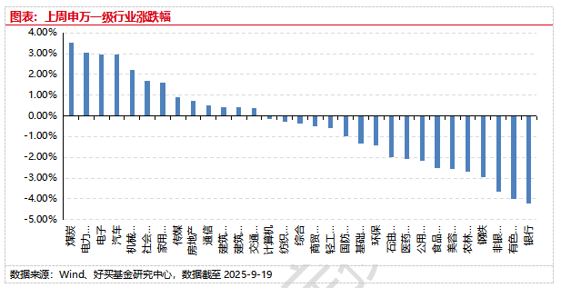 上周,滬深兩市漲跌互現(xiàn)。截止收盤,上證綜指收于3820.09點(diǎn),跌50.51點(diǎn),跌幅為1.30%;深成指收于13070.86點(diǎn),漲146.73點(diǎn),漲幅為1.14%;滬深300收于4501.92點(diǎn),跌20.08點(diǎn),跌幅為0.44%;創(chuàng)業(yè)板收于3091.00點(diǎn),漲70.58點(diǎn),漲幅為2.34%。31個(gè)申萬一級(jí)行業(yè)中有13個(gè)行業(yè)上漲。其中,煤炭、電力設(shè)備、電子表現(xiàn)居前,漲跌幅分別為3.51%、3.07%、2.96%,非銀金融、有色金屬、銀行表現(xiàn)居后,漲跌幅分別為-3.66%、-4.02%、-4.21%。