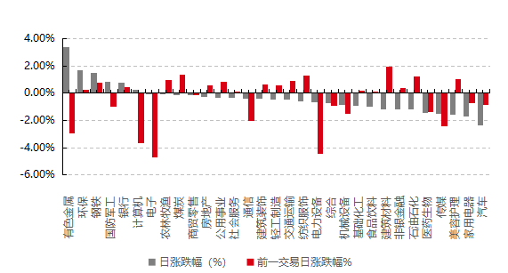 31個申萬一級行業(yè)中有6個行業(yè)上漲。其中,有色金屬、環(huán)保、鋼鐵表現(xiàn)居前,漲跌幅分別為3.35%、1.65%、1.49%,美容護理、家用電器、汽車表現(xiàn)居后,漲跌幅分別為-1.58%、-1.74%、-2.33%。滬市有748只個數(shù)上漲,占比32.76%,深市有862只個數(shù)上漲,占比30.03%。非ST個股中,60只個股漲停,7只個股跌停。股指期貨主力合約漲跌不一,其中,3只期指好于現(xiàn)貨指數(shù)。