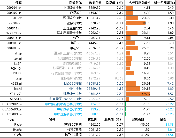 昨日,滬深兩市雙雙收跌。截止收盤,上證綜指收于3889.50點,跌30.74點,跌幅為0.19%;深成指收于13231.47點,跌38.92點,跌幅為0.93%;滬深300收于4593.98點,跌33.89點,跌幅為0.50%;創(chuàng)業(yè)板收于3078.76點,跌62.78點,跌幅為1.11%。兩市成交23547.41億元,較前一日交易量減少6.39%。小盤股強于大盤股。中證100下跌0.45%,中證500下跌0.29%。