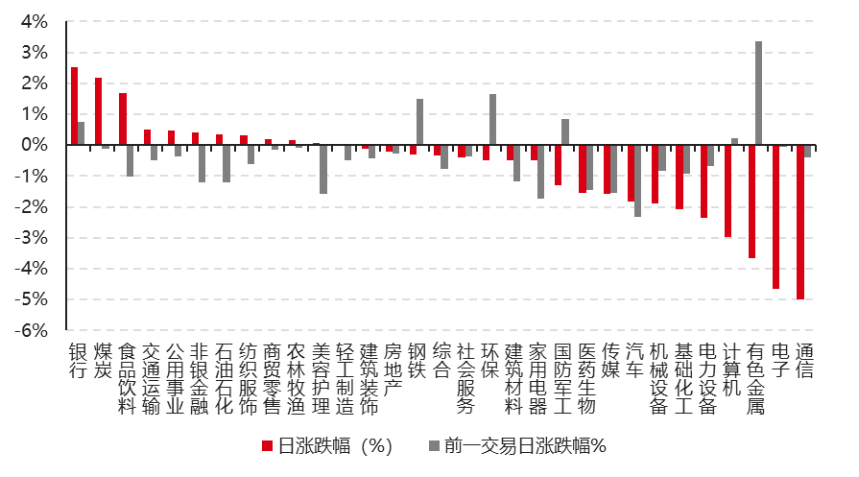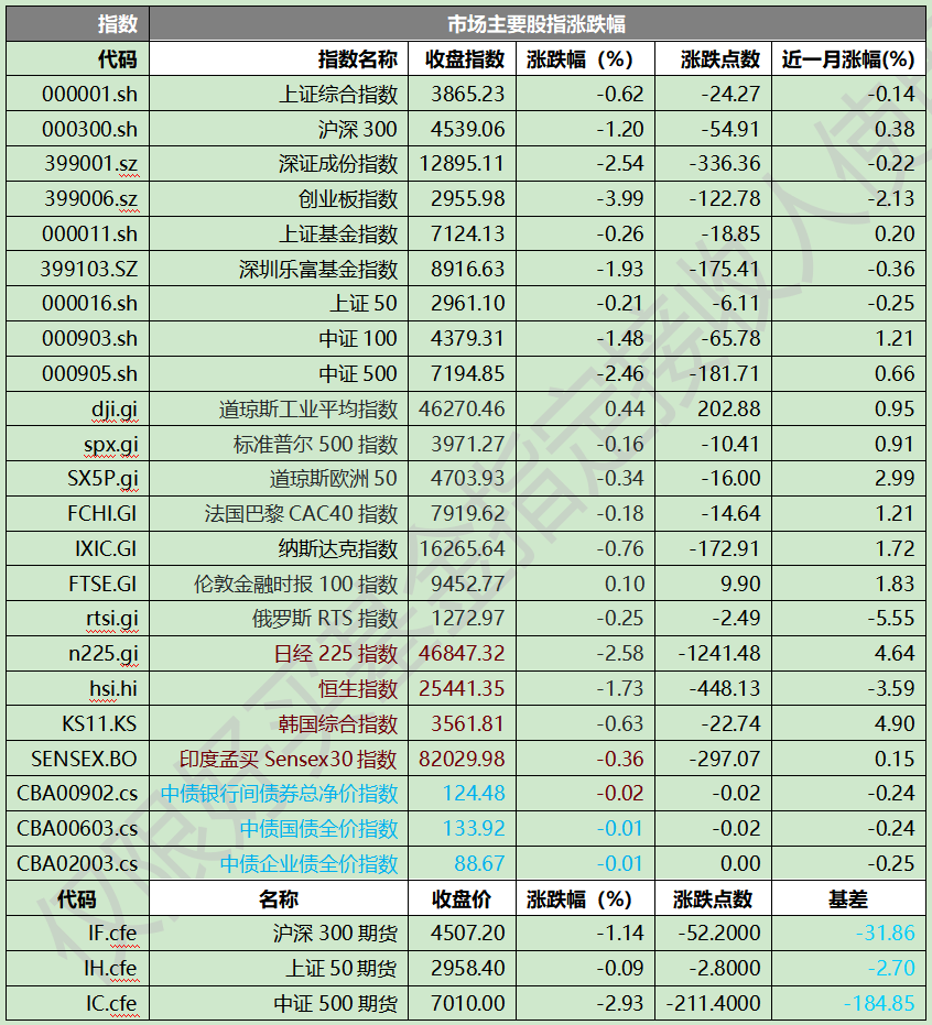 昨日,滬深兩市雙雙收跌。截至收盤,上證綜指收于3865.23點,跌24.27點,跌幅為0.62%;深成指收于12895.11點,跌336.36點,跌幅為2.54%;滬深300收于4539.06點,跌54.91點,跌幅為1.20%;創(chuàng)業(yè)板收于2955.98點,跌122.78點,跌幅為3.99%。兩市成交25762.33億元,較前一日成交額增加9.41%。大盤股強于小盤股。中證100下跌1.48%,中證500下跌2.46%。31個申萬一級行業(yè)中有11個行業(yè)上漲。其中,銀行、煤炭、食品飲料表現(xiàn)居前,漲跌幅分別為2.51%、2.18%、1.69%,有色金屬、電子、通信表現(xiàn)居后,漲跌幅分別為-3.66%、-4.64%、-4.98%。滬市有813只個數(shù)上漲,占比34.97%,深市有821只個數(shù)上漲,占比28.18%。非ST個股中,37只個股漲停,3只個股跌停。股指期貨主力合約3個合約均下跌,其中,2只期指好于現(xiàn)貨指數(shù)。