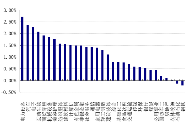 31個申萬一級行業(yè)中有29個行業(yè)上漲。其中,電力設(shè)備、汽車、電子表現(xiàn)居前,漲跌幅分別為2.72%、2.37%、2.29%,農(nóng)林牧漁、石油石化、鋼鐵表現(xiàn)居后,漲跌幅分別為0.01%、-0.14%、-0.21%。滬市有1798只個數(shù)上漲,占比77.33%,深市有2372只個數(shù)上漲,占比81.43%。非ST個股中,83只個股漲停,7只個股跌停。股指期貨主力合約漲跌不一,其中,0只期指好于現(xiàn)貨指數(shù)。