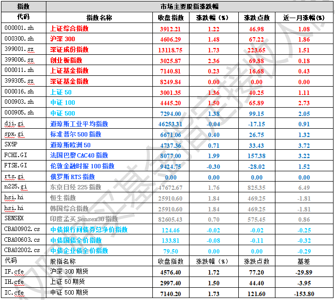 昨日,滬深兩市雙雙收漲。截止收盤,上證綜指收于3912.21點,漲46.98點,漲幅為1.22%;深成指收于13118.75點,漲223.65點,漲幅為1.73%;滬深300收于4606.29點,漲67.22點,漲幅為1.48%;創(chuàng)業(yè)板收于3025.87點,漲69.88點,漲幅為2.36%。兩市成交20728.59億元,較前一日交易量減少19.54%。大盤股強于小盤股。中證100上漲1.50%,中證500上漲1.38%。