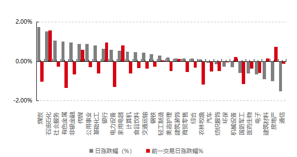 31個申萬一級行業(yè)中有21個行業(yè)上漲。其中,煤炭、石油石化、社會服務表現(xiàn)居前,漲跌幅分別為1.75%、1.52%、1.07%,建筑材料、房地產(chǎn)、通信表現(xiàn)居后,漲跌幅分別為-0.91%、-0.99%、-1.51%。滬市有1264只個數(shù)上漲,占比55.34%,深市有1655只個數(shù)上漲,占比57.59%。非ST個股中,59只個股漲停, 只個股跌停。股指期貨主力合約漲跌不一,其中,0只期指好于現(xiàn)貨指數(shù)。