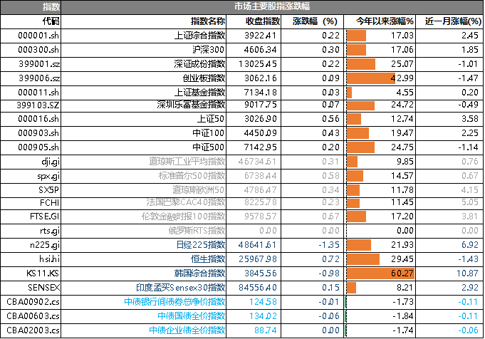昨日,滬深兩市雙雙收漲。截止收盤,上證綜指收于3922.41點,漲幅為0.22%,今年漲幅17.03%;深成指收于13025.45點,漲幅為0.22%,今年漲幅25.07%;滬深300收于4606.34點,漲幅為0.30%,今年漲幅17.06%;創(chuàng)業(yè)板收于3062.16點,漲幅為0.09%,今年漲幅42.99%。兩市成交16439.10億元,較前一日交易量減少1.44%。大盤股強于小盤股。中證100上漲0.43%,中證500上漲0.20%。