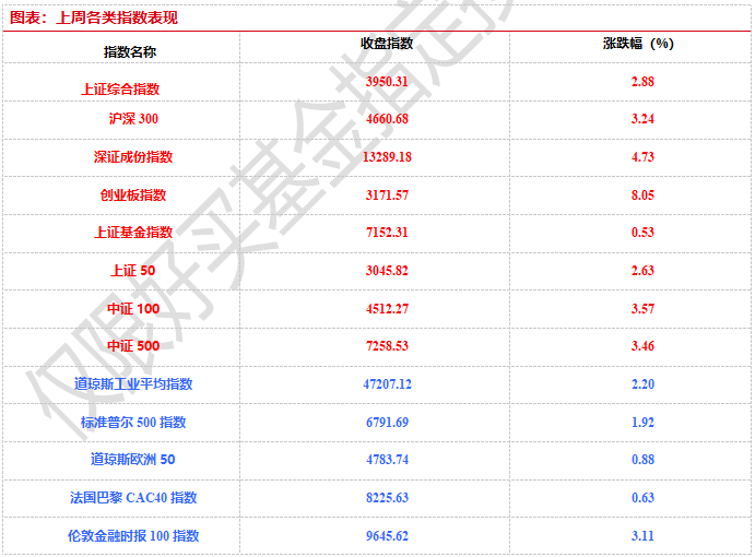 上周,滬深兩市雙雙收漲。截止收盤,上證綜指收于3950.31點(diǎn),漲110.56點(diǎn),漲幅為2.88%;深成指收于13289.18點(diǎn),漲600.25點(diǎn),漲幅為4.73%;滬深300收于4660.68點(diǎn),漲146.45點(diǎn),漲幅為3.24%;創(chuàng)業(yè)板收于3171.57點(diǎn),漲236.20點(diǎn),漲幅為8.05%。兩市成交88974.74億元??傮w而言,大盤股強(qiáng)于小盤股。中證100上漲3.57%,中證500上漲3.46%。