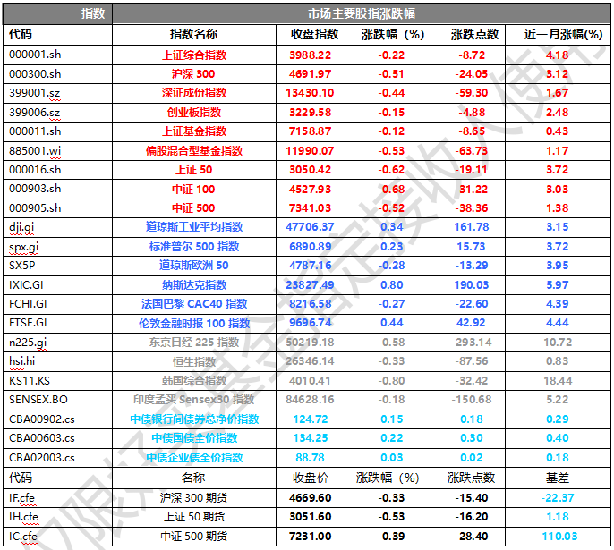 31個申萬一級行業(yè)中有10個行業(yè)上漲。其中,綜合(申萬)、國防軍工(申萬)、交通運輸(申萬)表現(xiàn)居前,漲跌幅分別為2.06%、1.07%、0.24%,鋼鐵(申萬)、美容護理(申萬)、有色金屬(申萬)表現(xiàn)居后,漲跌幅分別為-1.35%、-1.51%、-2.72%。滬市有943只個數(shù)上漲,占比47.75%,深市有1325只個數(shù)上漲,占比48.16%。非ST個股中,67只個股漲停,7只個股跌停。股指期貨主力合約3個合約均下跌,其中,3只期指好于現(xiàn)貨指數(shù)。