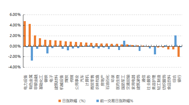 31個申萬一級行業(yè)中有24個行業(yè)上漲。其中,電力設(shè)備、有色金屬、非銀金融表現(xiàn)居前,漲跌幅分別為4.79%、4.28%、2.08%,食品飲料、綜合、銀行表現(xiàn)居后,漲跌幅分別為-0.56%、-0.56%、-1.98%。滬市有1113只個數(shù)上漲,占比48.73%,深市有1277只個數(shù)上漲,占比44.43%。非ST個股中,57只個股漲停,8只個股跌停。股指期貨主力合約3個合約均上漲,其中,2只期指好于現(xiàn)貨指數(shù)。