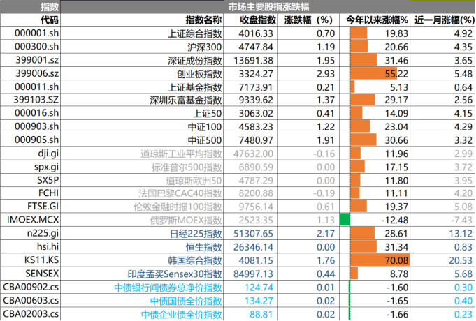 昨日,滬深兩市雙雙收漲。截止收盤,上證綜指收于4016.33點,漲幅為0.70%,今年漲幅19.83%;深成指收于13691.38點,漲幅為1.95%,今年漲幅31.46%;滬深300收于4747.84點,漲幅為1.19%,今年漲幅20.66%;創(chuàng)業(yè)板收于3324.27點,漲幅為2.93%,今年漲幅55.22%。兩市成交22560.30億元,較前一日交易量增加5.04%。小盤股強(qiáng)于大盤股。中證100上漲1.22%,中證500上漲1.91%。